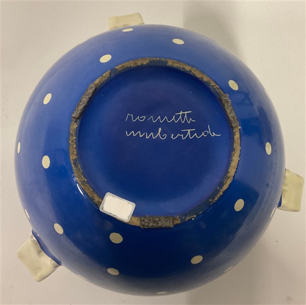 Vaso globulare triansato in ceramica smaltata blu a pois bianchi. Umbertide, anni '30/'40. Firmato e locato alla base. Recante etichetta. (h cm 19) (lievi difetti e piccoli restauri)