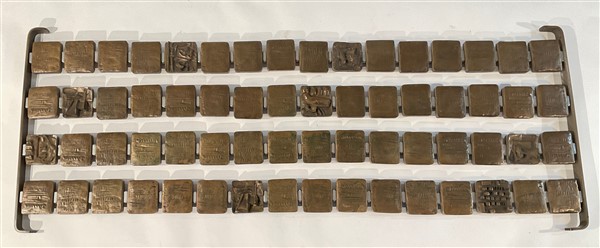 Pannello decorativo composto da sessantaquattro formelle in fusione di bronzo, decorate a graffito o a rilievo. Sottostruttura in tubolare di ottone e metallo. Italia, anni '50/'60. (cm 175,5x66)