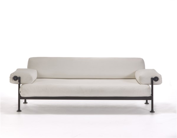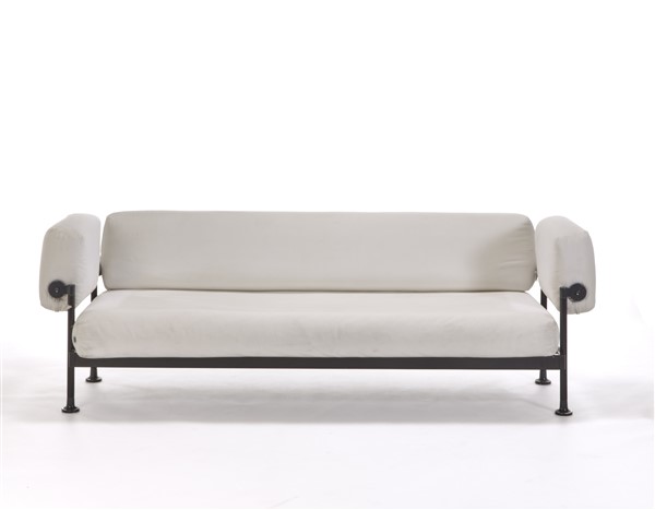 Divano modello "Taxi". Produzione BBB Bonacina, Meda, 1981. Metallo laccato grigio scuro e tessuto bianco. Modello fuori produzione. (cm 223x75x81) (difetti)
