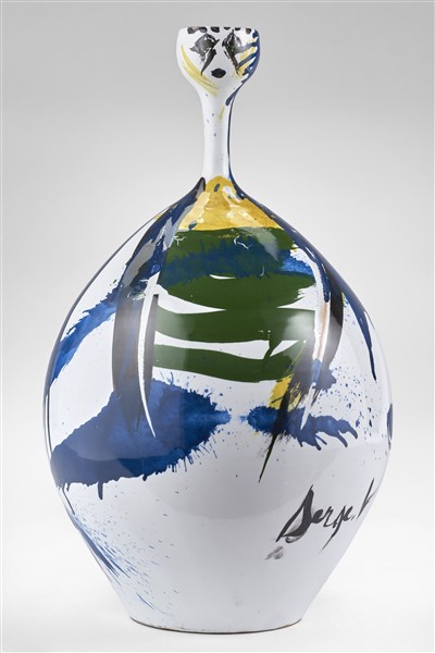 Vaso in ceramica smaltata dipinta in policromia. Manifattura Ceramiche San Giorgio, Albisola, anni '60/'70. Firmata su un lato "Serge J.". (h cm 40)