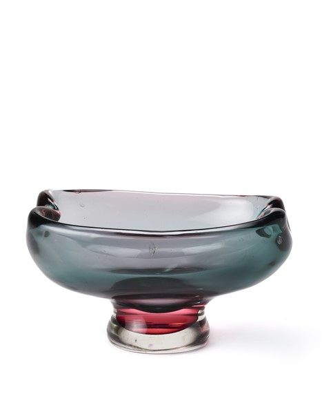 Centrotavola in vetro sommerso trasparente ametista, verde e ciclamino. Murano, anni '50/'60. (cm 26x14,7) (difetti)