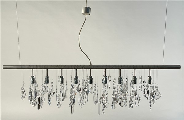 Lampada a sospensione a nove luci modello "Cellula 90". Italia, 1997. Struttura in acciaio con pendenti in cristallo. (l cm 100)