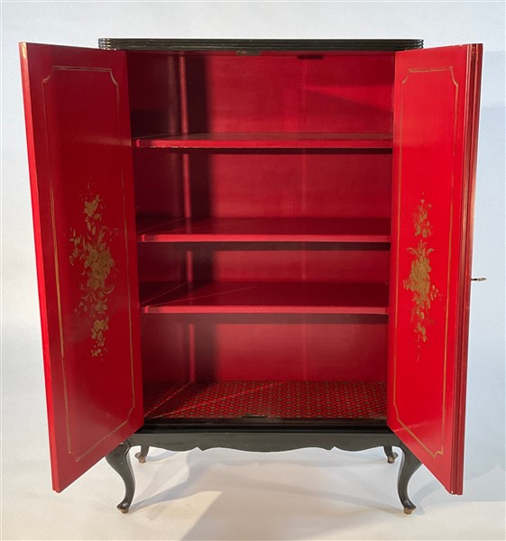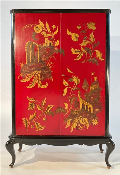 Mobile contenitore a due ante in legno ebanizzato e laccato rosso con decori vegetali e di rovine in oro. Italia, anni '50. (cm 110x160x43)