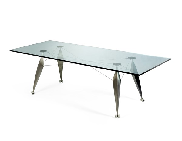 Tavolo da pranzo. Italia, anni '90/2000. Piano rettangolare in cristallo molato di forte spessore, gambe in lastra di acciaio a sagoma poliedrica, tiranti in corda di acciaio. (cm 239,5x74x99,5) (difetti)