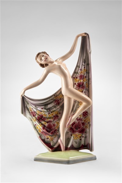 Scultura raffigurante danzatrice modello "8749". Austria, anni '30/'40. Ceramica modellata a colaggio dipinta in policromia sotto vetrina. Marchio della manifattura e numerali sotto la base. (h max cm 50) (lievi difetti)