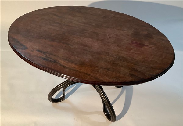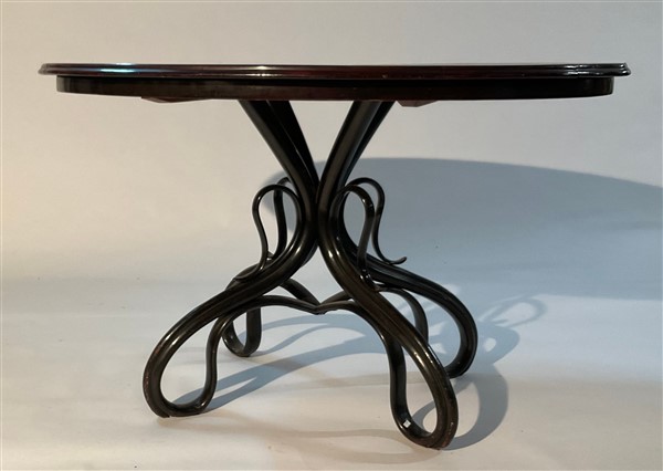 Tavolo con piano di forma ovale in legno impiallacciato, struttura in faggio curvato al vapore e tinto nero. Centro Europa, inizio secolo XX. (cm 129x79x88) (difetti e restauri)