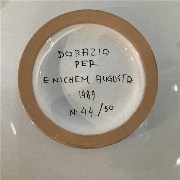 Piatto in ceramica smaltata in policromia, multiplo. Italia, anni '70. Decorato in policromia. Firmato alla base "Piero Dorazio". (d cm 32)