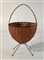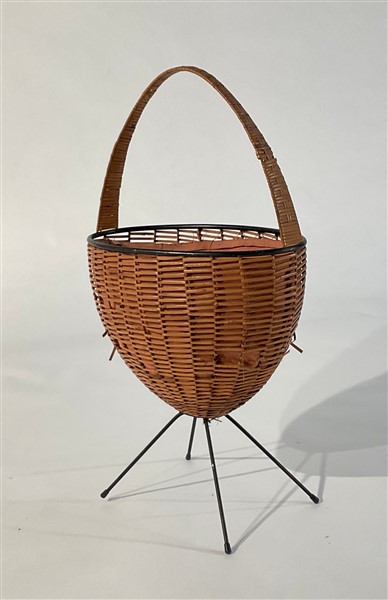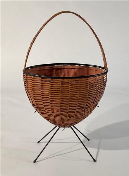 Cestino portalavoro. Struttura in tondino in metallo verniciato nero e piedini in metallo, rivestimento in giunco. Italia, anni '60. (cm 46x82x29) (gravi difetti)