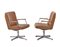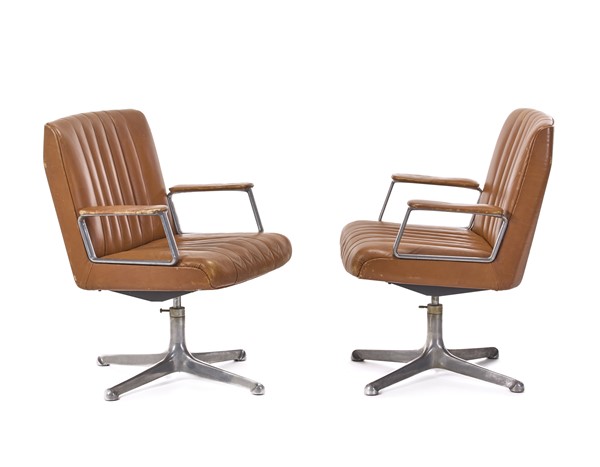 Coppia di poltroncine da ufficio girevoli modello "P125". Produzione Tecno, Varedo, 1965. Alluminio pressofuso e rivestimento in pelle marrone. (cm 64,5x83x66) (difetti alla pelle)