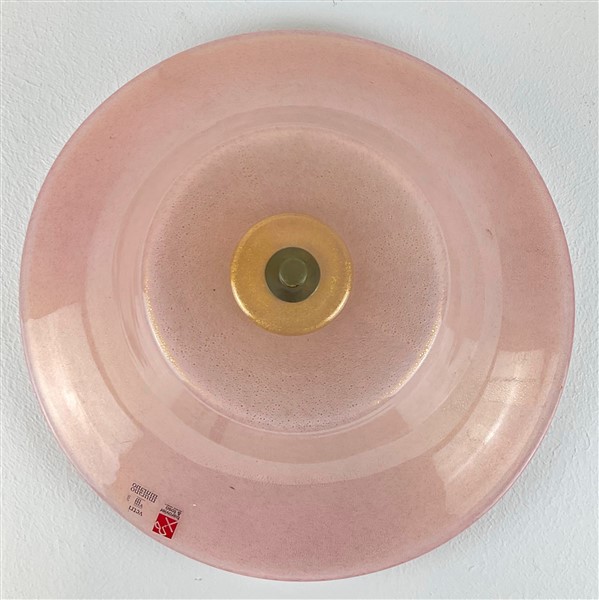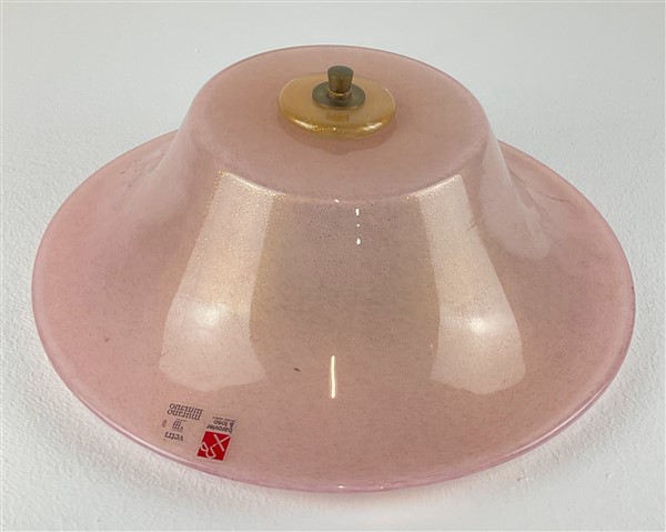 Plafoniera a tre luci in vetro soffiato a macchie rosa con applicazioni di foglia d'oro. Murano, anni '90/2000. Recante etichetta adesiva. (d cm 36)