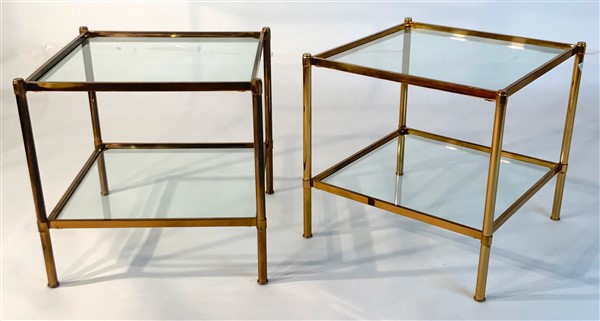Coppia di tavolini in ottone lucidato con piani in cristallo molato. Italia, anni '60/'70. (cm 53,5x52x53,5) (lievi difetti)