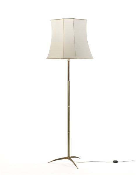Lampada da terra con fusto fascio composto da sei tondini in metallo verniciato bianco e un'asta centrale in ottone decorato, paralume in tessuto bianco. Italia, anni '40/'50. (h cm 177; d cm 56) (lievi difetti)