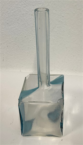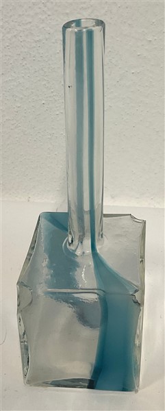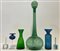 Lotto composto da una caraffa da vino azzurra, una grande bottiglia in vetro verde di manifattura di Empoli, una caraffa in vetro verde, un calice in vetro blu e due vasetti soliflore, Studio Venini per Pierre Cardin. Italia, anni '60/'70. (h max cm 71) (difetti)