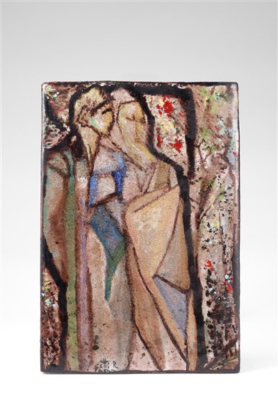Formella in ceramica smaltata in policromia sotto vetrina con due figure antropomorfe. Faenza, seconda metà secolo XX. Firmato "Gatti R. Faenza" al verso. (cm 25,3x37,5)