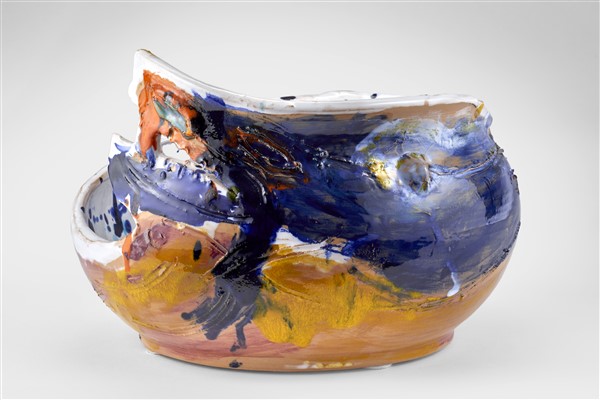 Centrotavola di forma irregolare in ceramica smaltata dipinta in policromia. Manifattura Ceramiche San Giorgio, Albisola, seconda metà secolo XX. Firmato e datato alla base. (h cm 18,5 ; d cm 28,5)