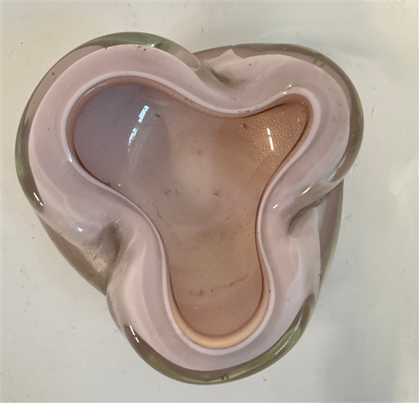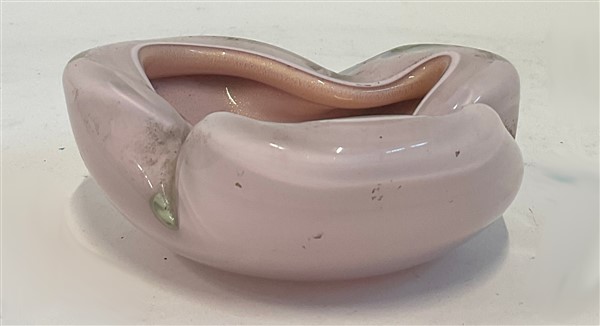 Posacenere in vetro soffiato sommerso di color lattimo, rosa e trasparente con applicazione di foglia d'oro. Seconda metà secolo XX. (cm 15x5,2) (lievi difetti)
