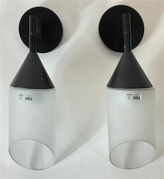 Coppia di applique. Italia, anni '90/2000. Struttura in metallo verniciato e paralume a calice in vetro trasparente e acidato con superfici esterne satinate. Recante etichetta. (h cm 42) (lievi difetti)