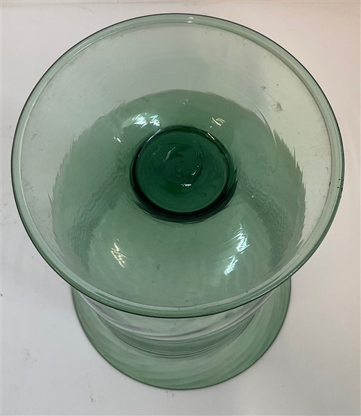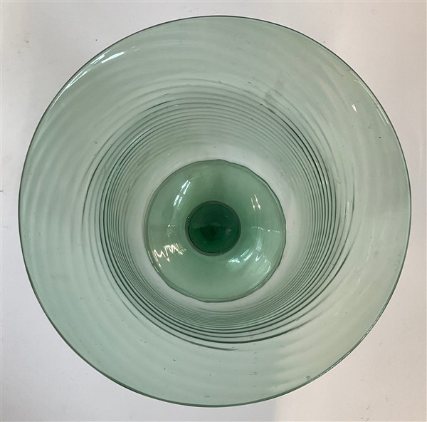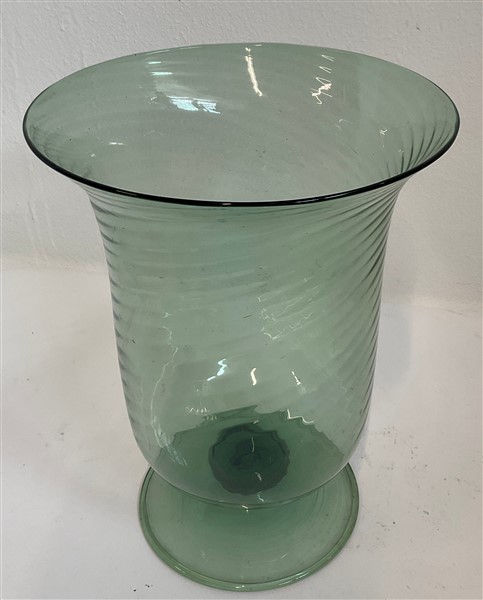 Grande vaso in vetro soffiato verde trasparente a costolature ritorte. Seconda metà secolo XX. (h cm 30,5)