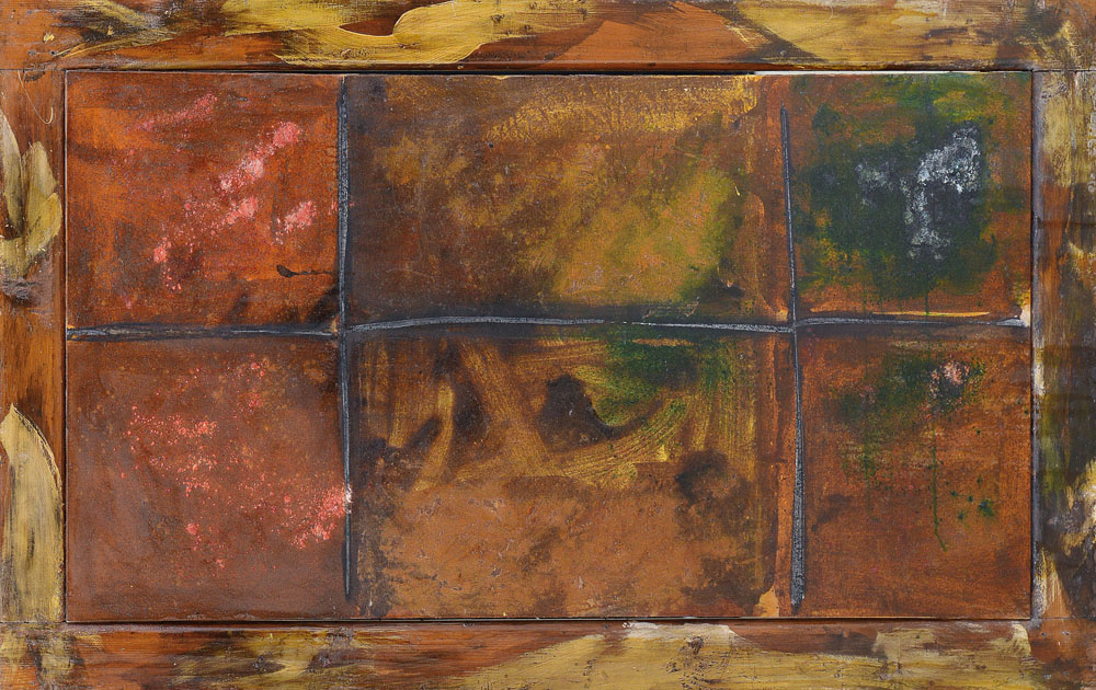 colori vegetali su tela e tavola cm. 90x164, firma, anno, titolo e tecnica ed etichetta della Galleria Break (Roma) al retro.