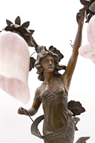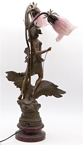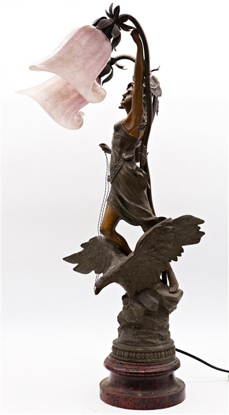 Lampada d'appoggio con sostegno a figura su rapace in antimonio con base in legno dipinto, a due luci con paralumi in vetro rosa. Inizio secolo XX (h cm 67) (difetti)