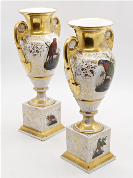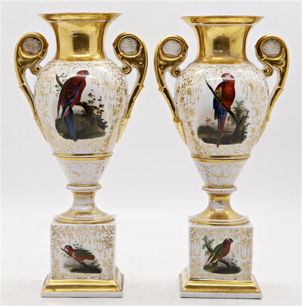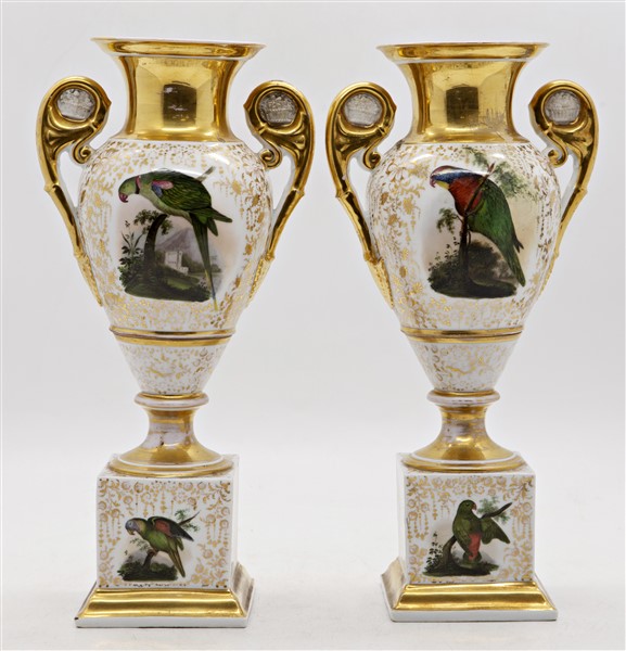 Manifattura francese, secolo XIX. Coppia di vasi biansati in porcellana su basi a plinto, corpo decorato da pappagalli in policromia, profili e decori floreali dorati (h. cm 35) (difetti, restauri e rotture)