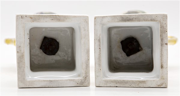 Manifattura francese, secolo XIX. Coppia di vasi biansati in porcellana su basi