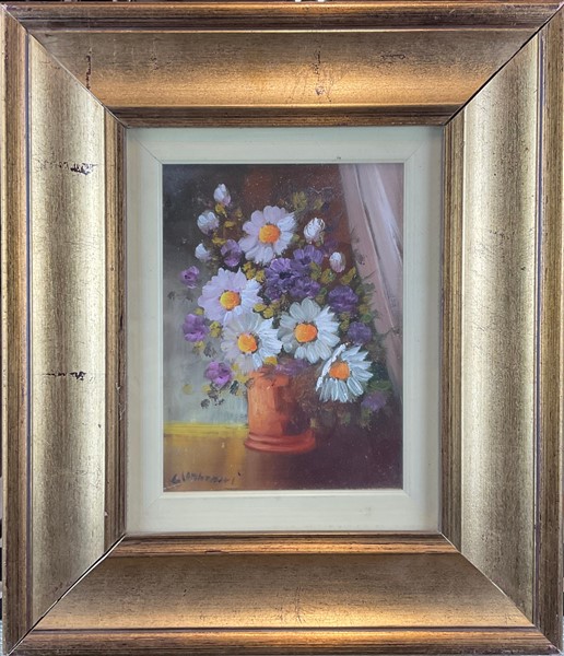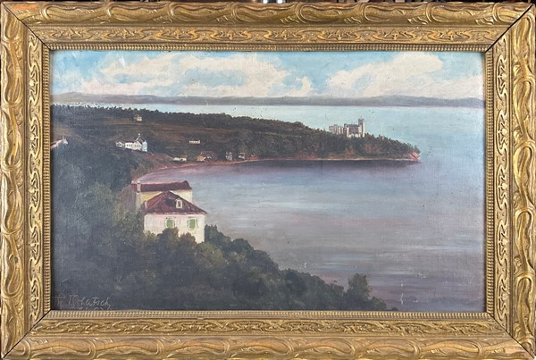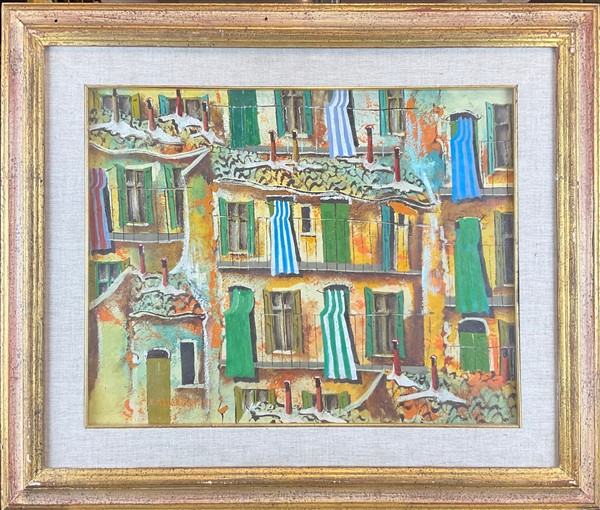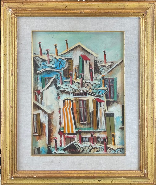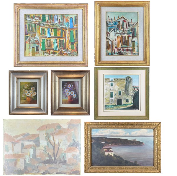 Cartone contenete sette diversi dipinti a soggetto e tecnica diversa di autori differenti (cm max 50x70). Uno privo di cornice (difetti)