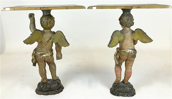 Coppia di console in legno intagliato, dorato e dipinto in policromia con sostegno a foggia di angelo su zolla, secolo XIX. Piani dipinti a finto marmo di epoca successiva (cm 60x72x32) (difetti)