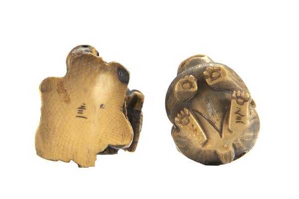 Due netsuke in avorio raffigurante scimmia su coniglio e drago Giappone, period