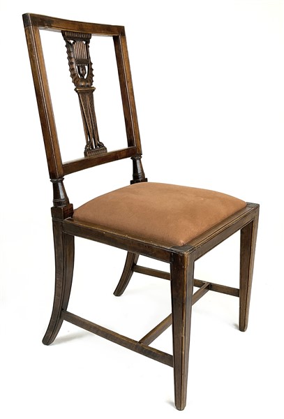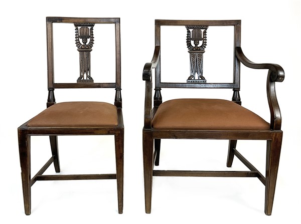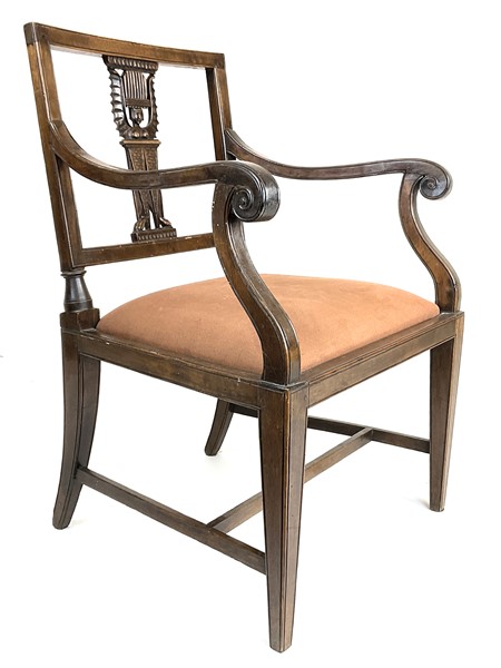 Lotto composto da una poltrona e una sedia in noce, schienale a giorno con cartella intagliata a figura alata stilizzata. Secolo XIX (difetti)