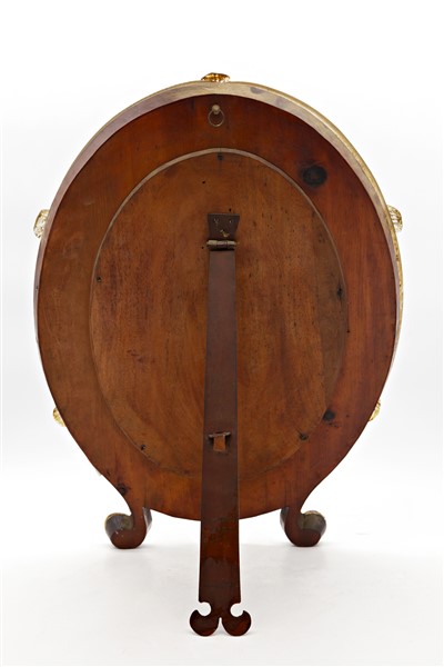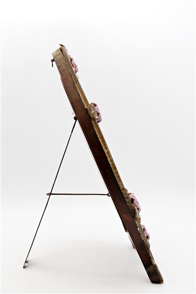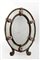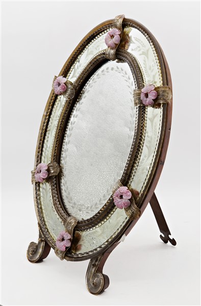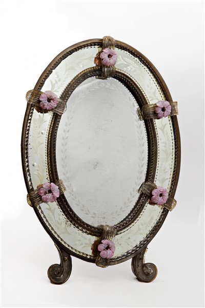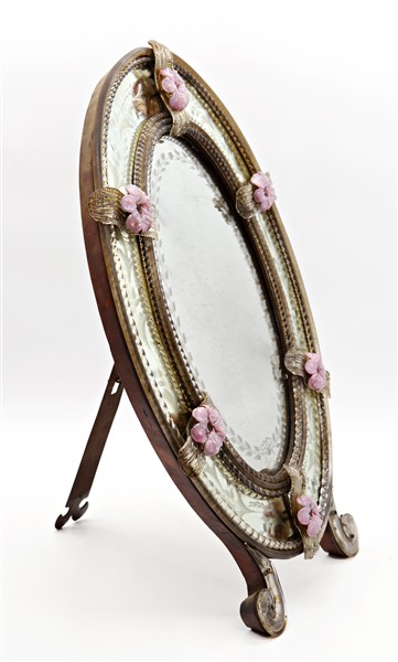 Manifattura di Murano, secolo XIX-XX. Specchiera da toilette a doppio ordine di forma ovale, decorata da applicazioni di fiori policromi e profilata da cordoli ritorti in vetro. Piedi a ricciolo (cm 55x39) (difetti)
