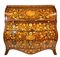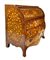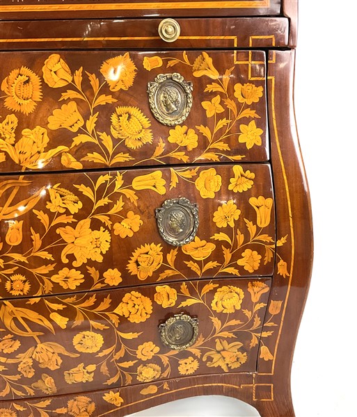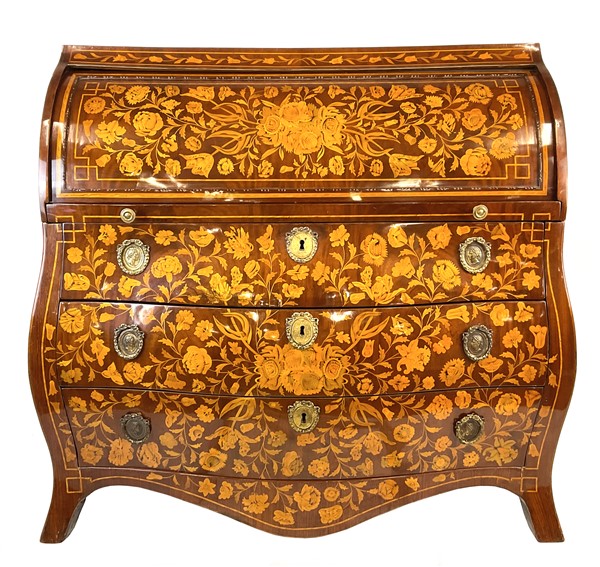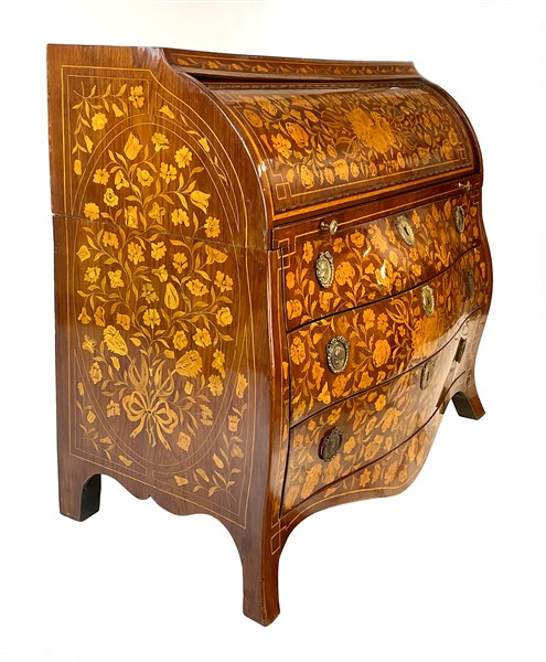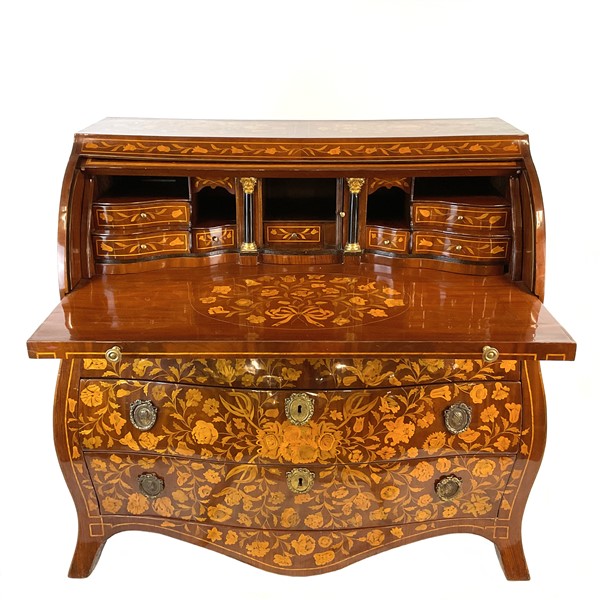 Ribalta bombata lastronata in mogano ed intarsiata in legni di varie essenze a motivi floreali, fronte a tre cassetti e calatoia a rullo celante sette cassettini e tre vani a giorno con due semi colonne e serrandina. Olanda, secolo XIX (cm 122x102,5x62) (difetti e restauri)