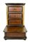 Antico inginocchiatoio lombardo in noce con profili ebanizzati e montanti decorati e incisi. Fronte ad un cassetto e due finti cassetti con specchiature in radica, predellino ribaltabile alla base (cm 57x90x56) (difetti e mancanze)