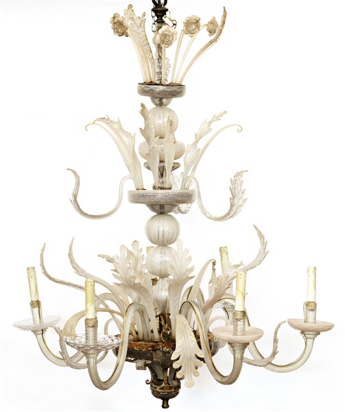 Manifattura di Murano. Lampadario a sei fiamme in vetro soffiato incolore con bracci a volute, decorato da foglie e pendenti a fiori su tre ordini. Fusto a sfere (h cm 125 circa) (difetti e mancanze)