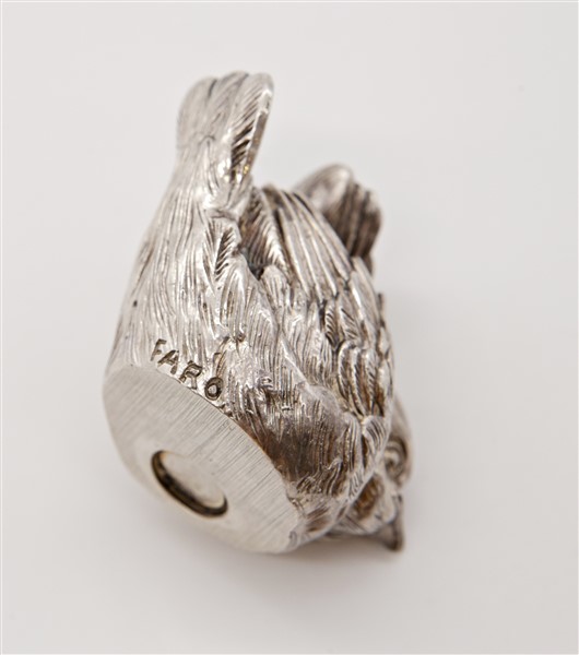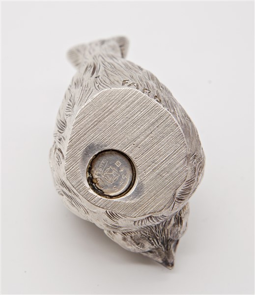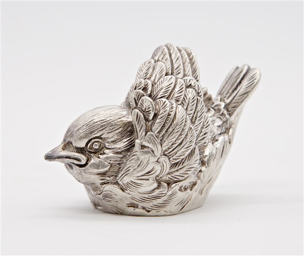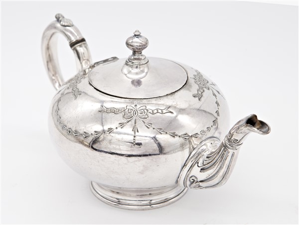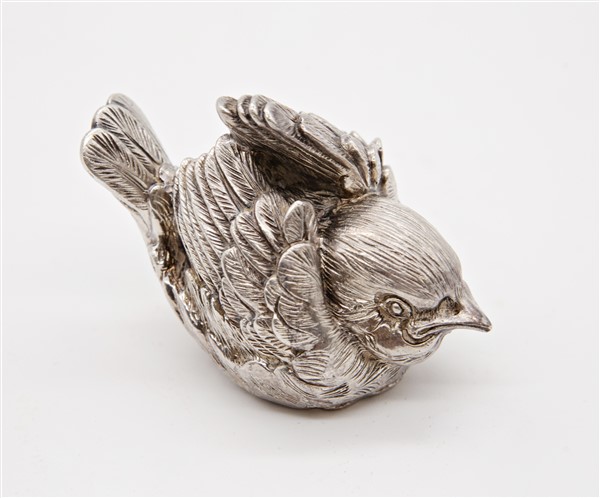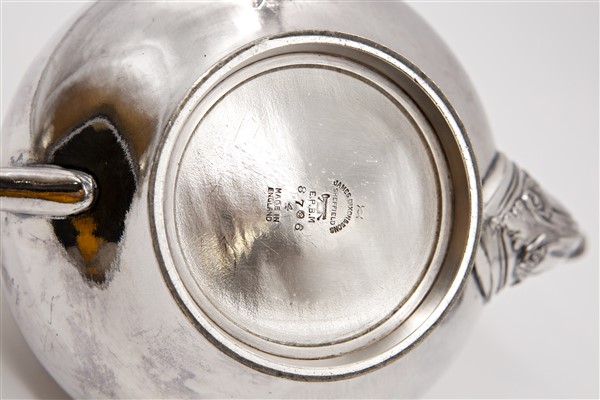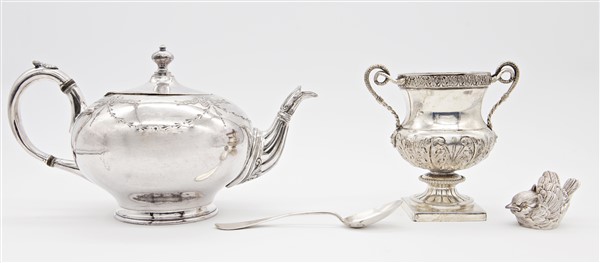 Lotto composto da una teiera e una coppa biansata in Old Sheffield, un cucchiaino in metallo argentato ed un uccellino in resina argentata (l max cm 27) (difetti)