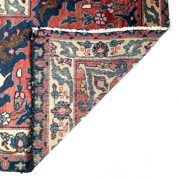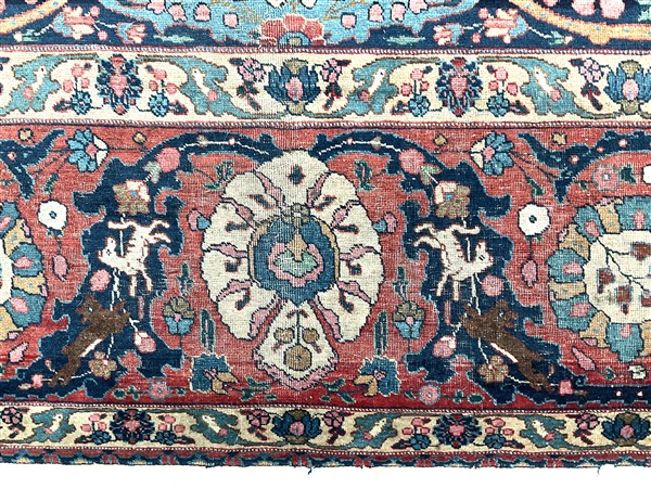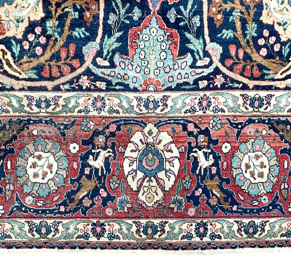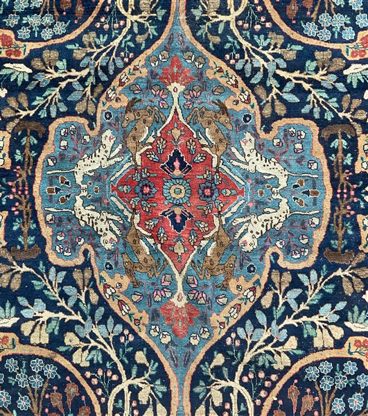 Tappeto Sarouk, Persia, prima metà secolo XX. Decoro con grande medaglione azzurro con puntali su campo blu notte ricco di motivi safavidi, rami fioriti e volatili, bordura Herati di grandi dimensioni (cm 498x338) (difetti e rapature)