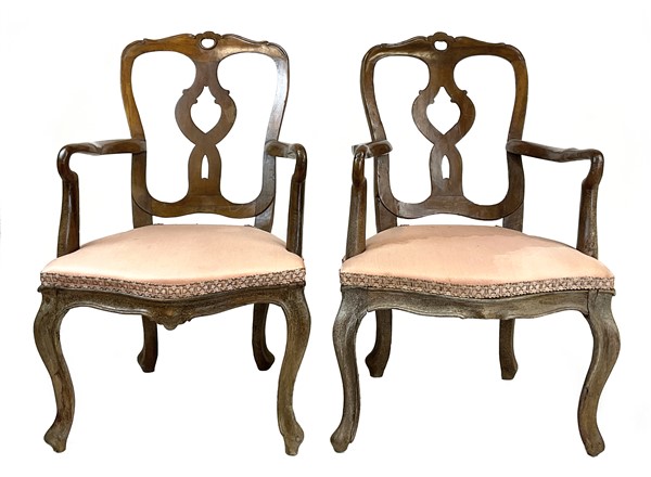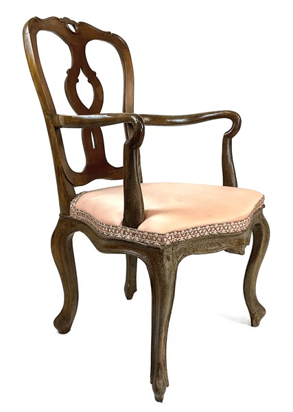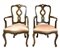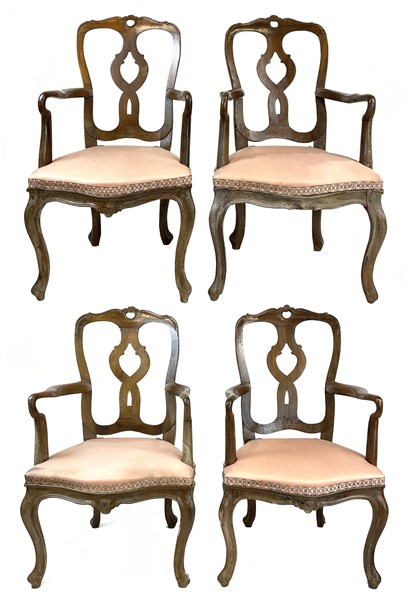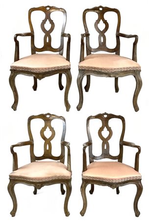 Gruppo di quattro poltrone in noce con braccioli e gambe mosse, schienale a giorno con cartella traforata ed intrecciata, seduta imbottita. Veneto, secolo XVIII-XIX (difetti, restauri e mancanze)