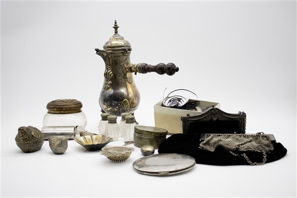Cartone contenente numerosi e differenti oggetti in metallo, metallo argentato ed altri materiali (difetti e rotture)