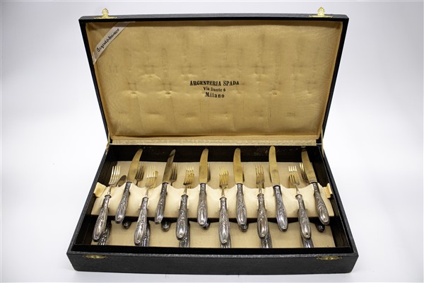 Cartone contenente numerosi e differenti oggetti in metallo, metallo argentato