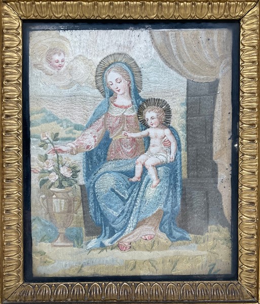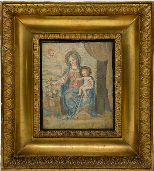 Manifattura del secolo XIX. Ricamo raffigurante Madonna con Bambino (cm 19x15,5) In cornice coeva (difetti)