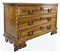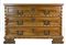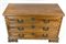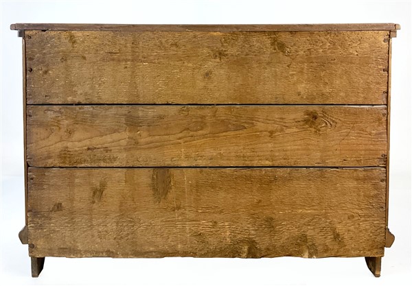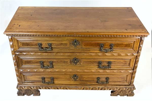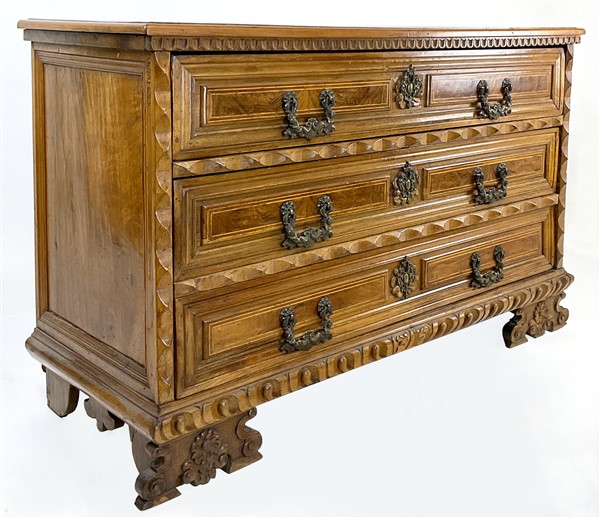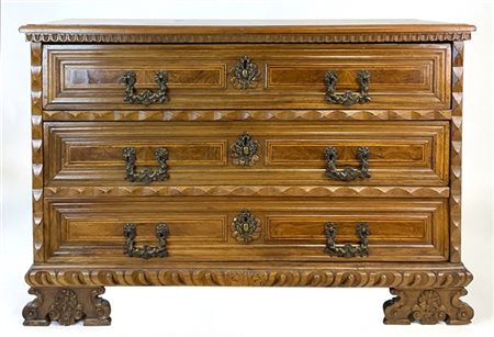 Antico cassettone in noce e legni vari a tre cassetti sul fronte con cartelle filettate, bordure bugnate e unghiate, piedi a mensola con volute (cm 130x85x53) (difetti)