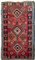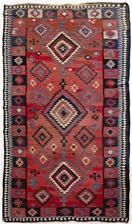 Tappeto Kilim, Anatolia, inizio secolo XX. Decoro con tre medaglioni romboidali policromi su fondo rosso (cm 259x137) (difetti)