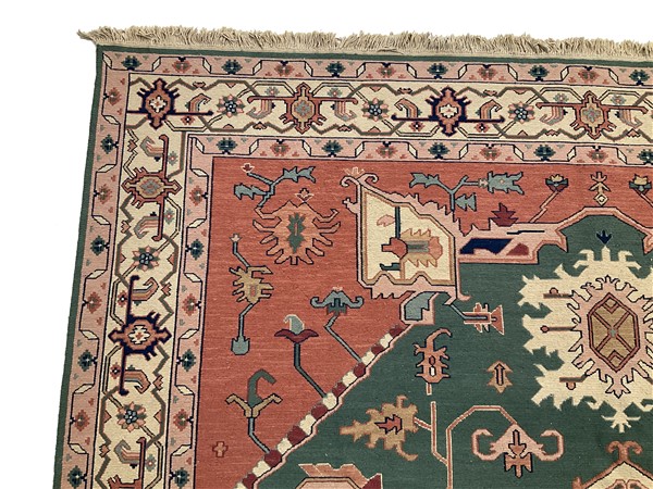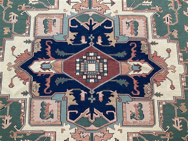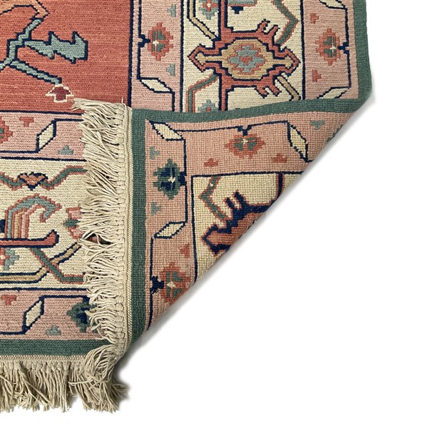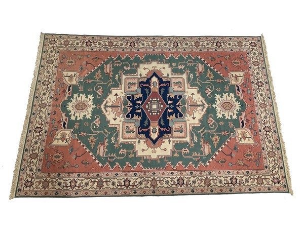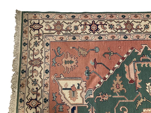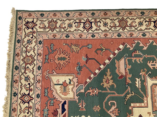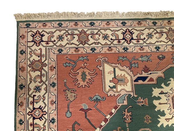 Tappeto di recente manifattura, Nepal(?) Realizzato con la tecnica Soumak in lana. Decoro Heritz con medaglione nei toni del rosso, blu, verde e bianco. Bordura Herati su fondo bianco (cm 422x298) (difetti)