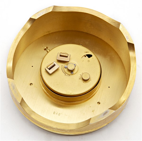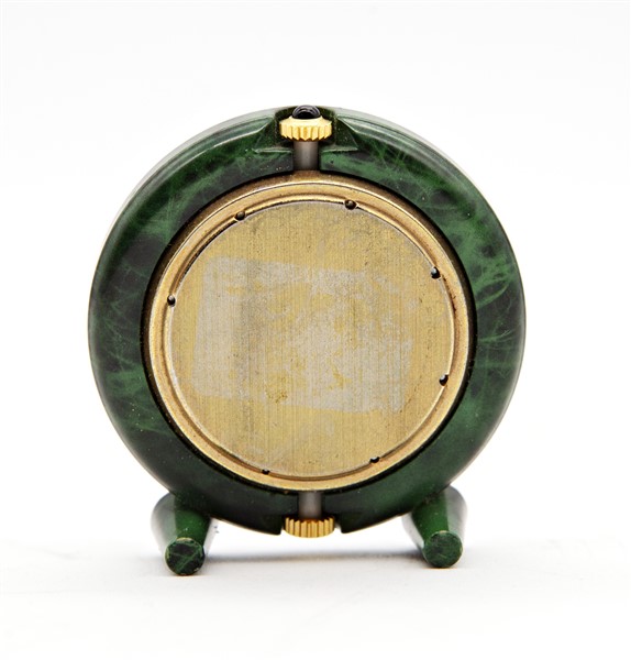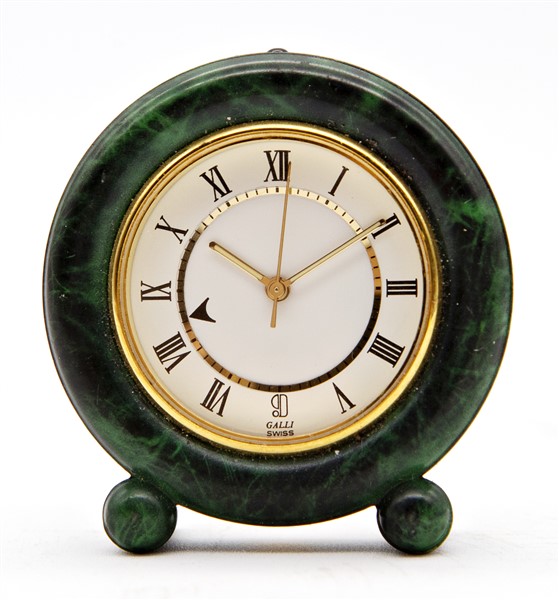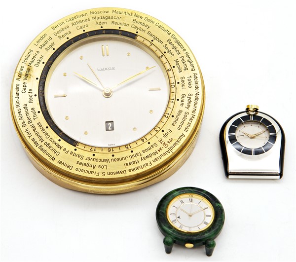 Lotto composto da un orologio pendente con sveglia marcato Jaeger-LeCoultre e due orologi da tavolo uno con cornice in marmo verde firmato Galli ed uno in metallo dorato marcato Luxor Swiss (d max cm 11) (difetti)