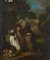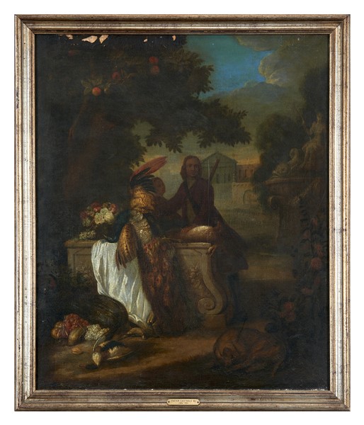 "Scorcio di parco con villa sullo sfondo e cacciatore con selvaggina esposta su un frammento classico"