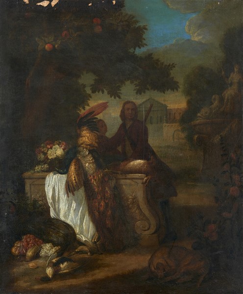 "Glimpse of park with villa in the background and hunter with game on display on an a classical architectural fragment"