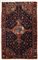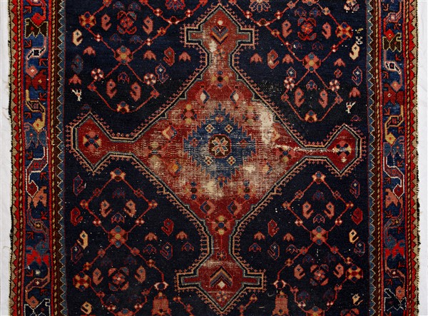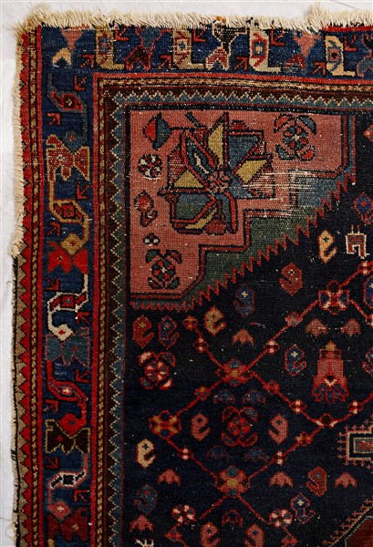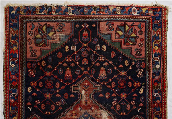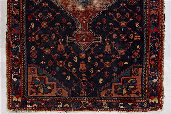 Tappeto Malayer, Persia, inizio secolo XX. Decoro con grande medaglione a croce su campo blu notte cosparso di rami fioriti (cm 196x124) (difetti e rapature)