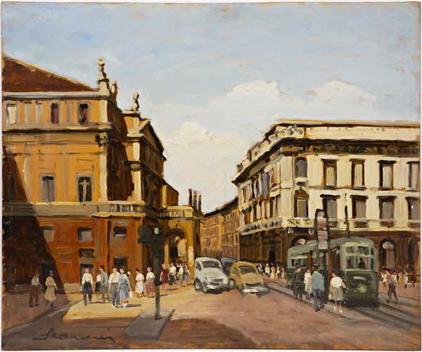 Annibale Scaroni "Piazza della Scala" 1955 olio su compensato (cm 50x60) firmat