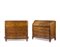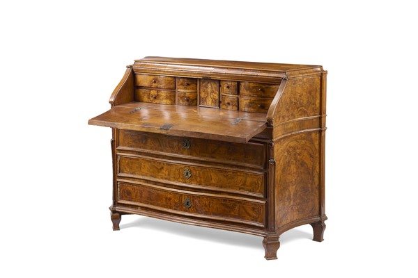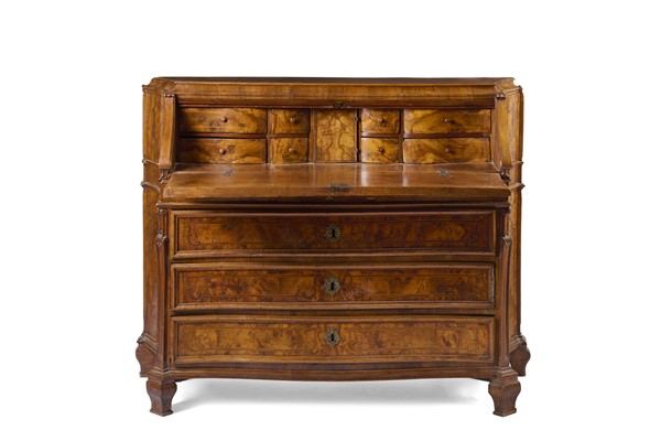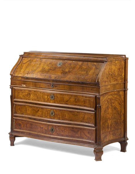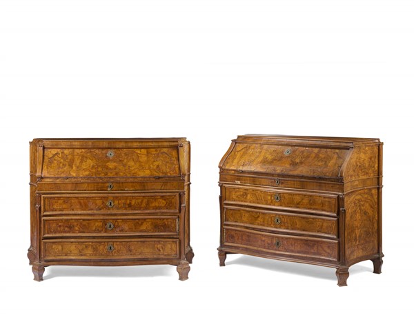 Coppia di ribalte di linea mossa lastronate in noce e radica di noce, filettate in legno chiaro, tre cassetti sul fronte sotto uno a mezza lunghezza, anta ribaltabile celante otto tiretti ed anta centrale. Lombardia, secolo XVIII (cm 145x120x57) (difetti e restauri)