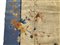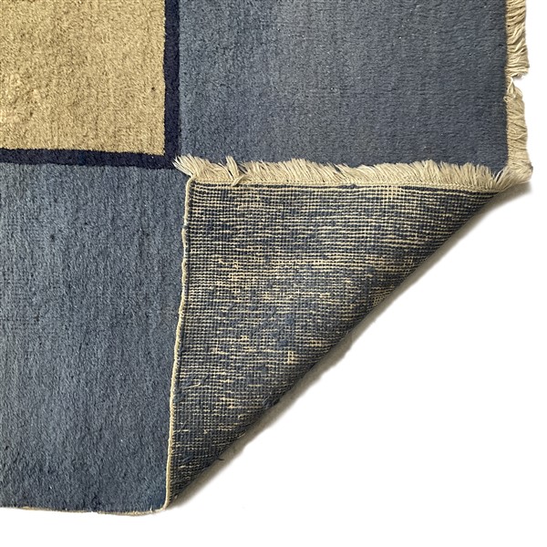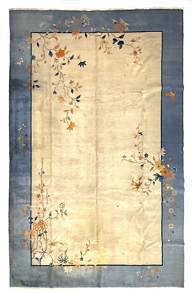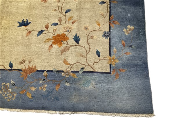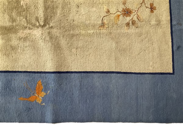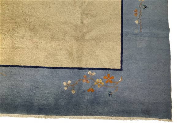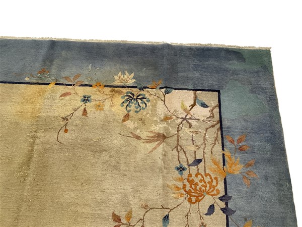 Tappeto Decò, Cina. Inizio secolo XX. Decoro floreale asimmetrico nei toni dell’arancio, azzurro, blu,giallo e nocciola su campo beige e bordura azzurra. (cm 533x366) (difetti, vecchi restauri, macchie)
